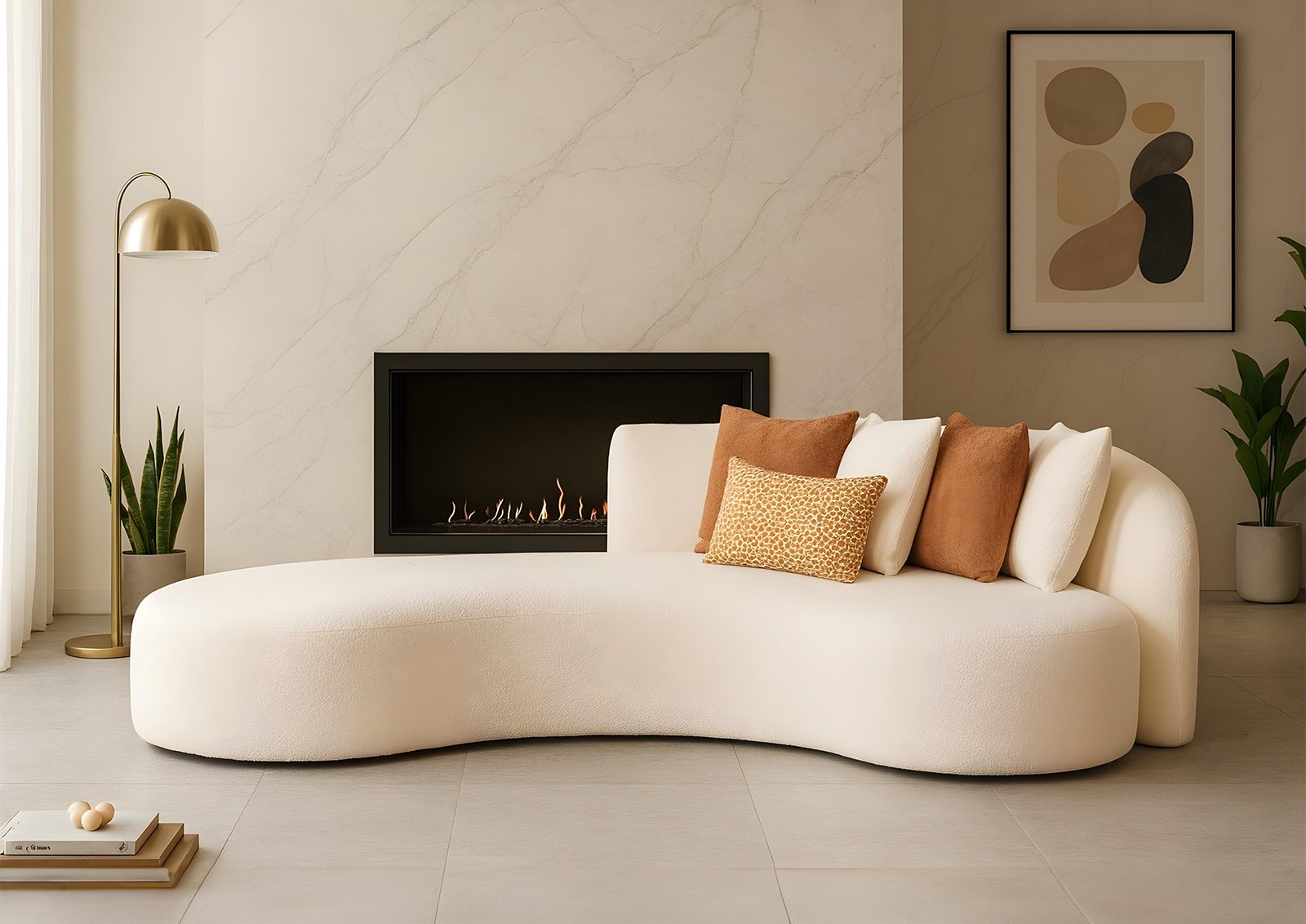 Élégant et contemporain, le canapé Lorenzo séduit par ses courbes douces, son tissu bouclette et son confort enveloppant. Une pièce design qui allie style et bien-être au quotidien.