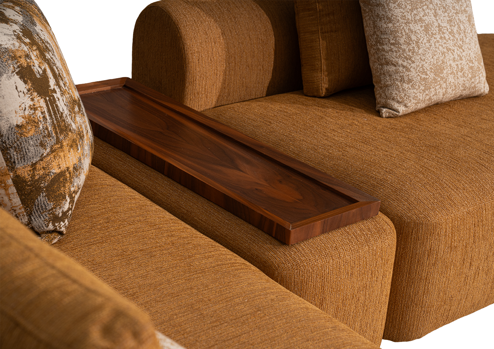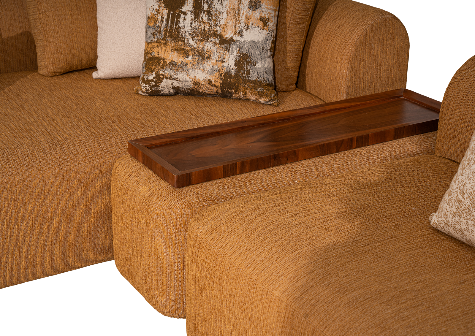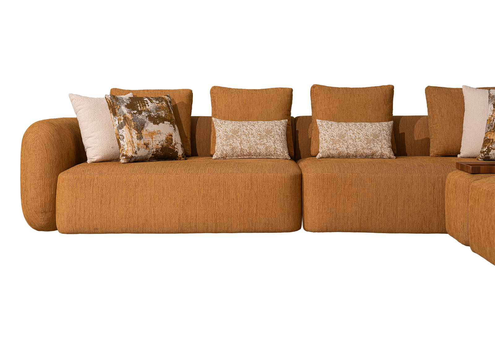 Sa couleur ocre, profonde et lumineuse, apporte du caractère et une touche contemporaine à votre intérieur. Le modèle est complété par un plateau intégré en bois, astucieusement placé entre deux modules, offrant une surface fonctionnelle pour poser livres, objets ou boissons. Les coussins décoratifs aux motifs imprimés viennent parfaire l’ensemble, ajoutant texture et personnalité au salon.